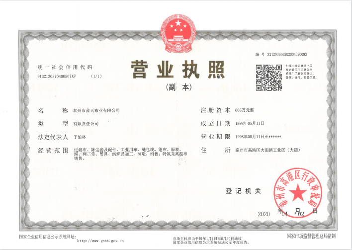 公司專業(yè)從事紡織業(yè)生產已三十多年,已成為一家從紡絲、織造、后整理到后加工一條龍的企業(yè)。公司位于江蘇省泰州市高港區(qū)大泗工業(yè)園區(qū),交通方便,占地100余畝,擁有現(xiàn)代化標準廠房,現(xiàn)有員工120人,年產過濾布300萬米、除塵布袋600萬米、縫包線、長絲線4...